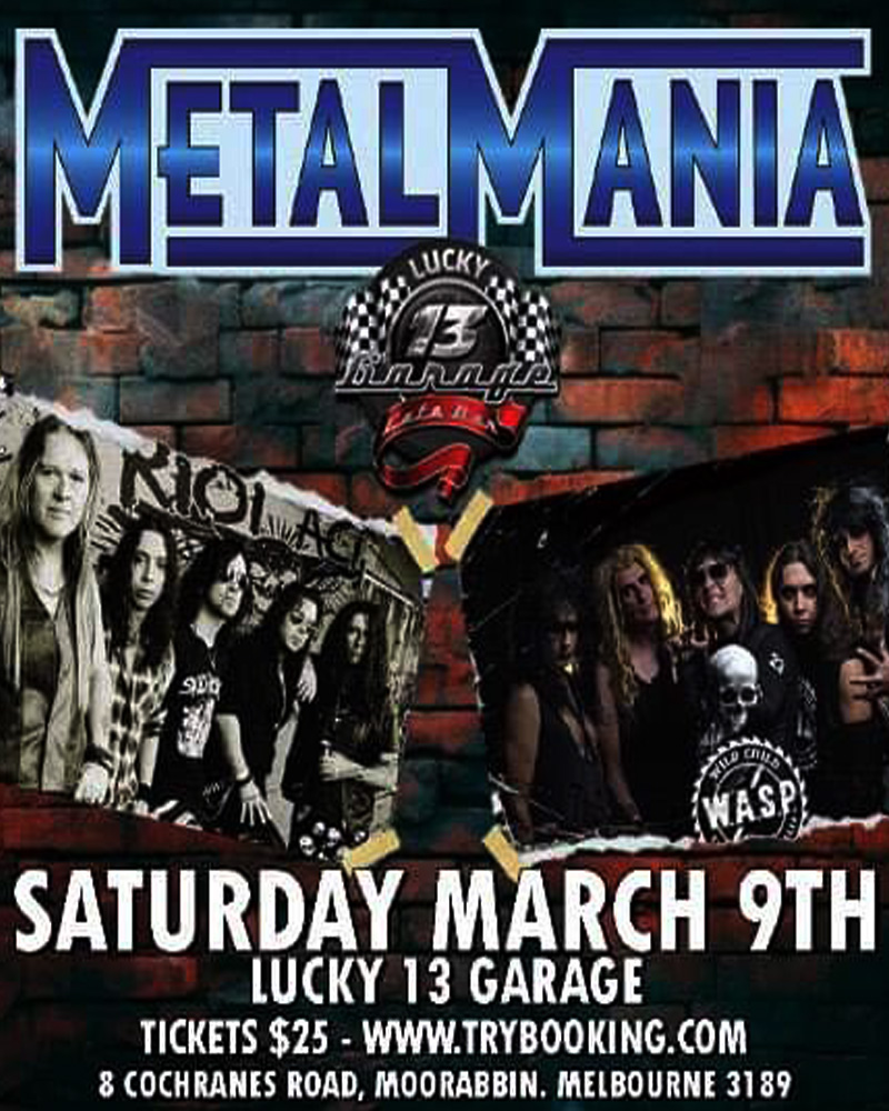 Metal Mania Entertainment present a night of pure rock ‘n’ roll nostalgia as Wild Child – Australia’s Ultimate W.A.S.P Tribute Band & RIOT ACT – The Australian SKID ROW Show take the stage at Lucky 13 Garage in Moorabbin for the first time for Metal Mania 5!!